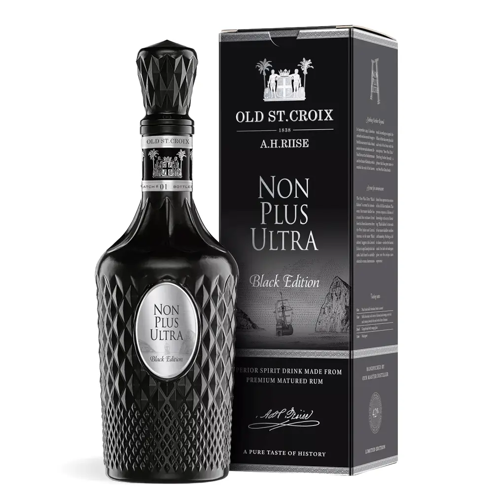 A.H. Riise Old St. Croix Non Plus Ultra Black Edition rum predstavlja najtamniju i najintenzivniju interpretaciju slavne Non Plus Ultra linije. Ovaj izvanredni rum nastaje blendanjem najstarijih i najkvalitetnijih karipskih destilata, koji odležavaju u posebno paljenim bačvama od hrasta, porto vina i sherryja. Rezultat je rum duboke boje i bogatog karaktera, s aromama karamele, prženog šećera, duhana i tamne čokolade. Na nepcu je baršunast i pun, s notama pržene kave, vanilije i meda koje se postupno stapaju u dug, topao završetak.