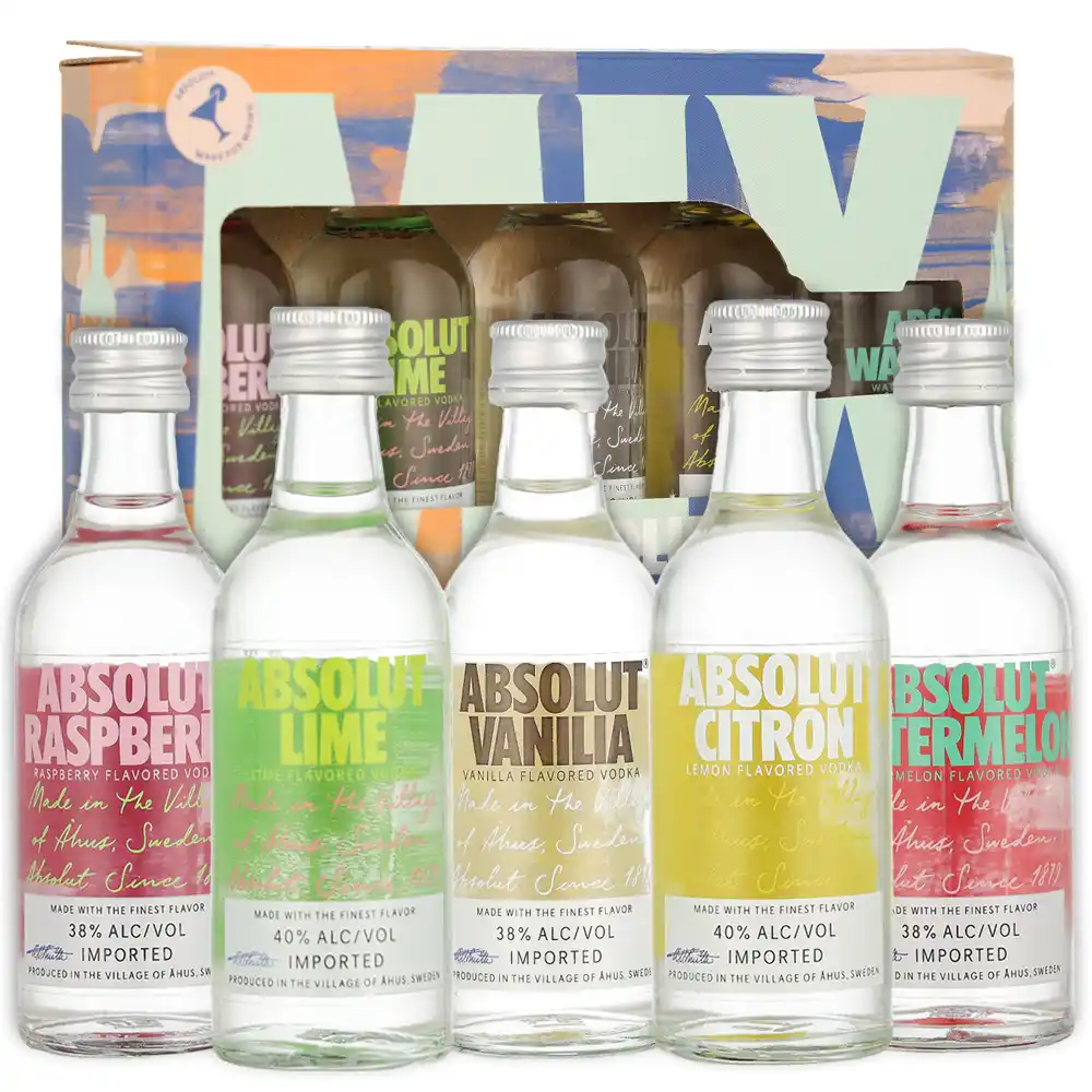 Absolut Flavored Vodka Set Minijatura sadrži mini verzije najomiljenijih aromatiziranih votki brenda Absolut, prepoznatljivih po čistoći i bogatom spektru okusa: Raspberri, Lime, Vanilla, Citron i Pears. Izrađene od visokokvalitetne švedske zimske pšenice i čiste izvorske vode, ove votke prolaze kroz kontinuirani proces destilacije koji jamči neutralnu bazu i meku teksturu. Svaki od uključenih okusa – poput maline, citrusa, vanilije, kruške ili limete – pažljivo je razvijen kako bi se postigla idealna ravnoteža prirodnih aroma i svježine, što rezultira karakterističnim Absolut potpisom.