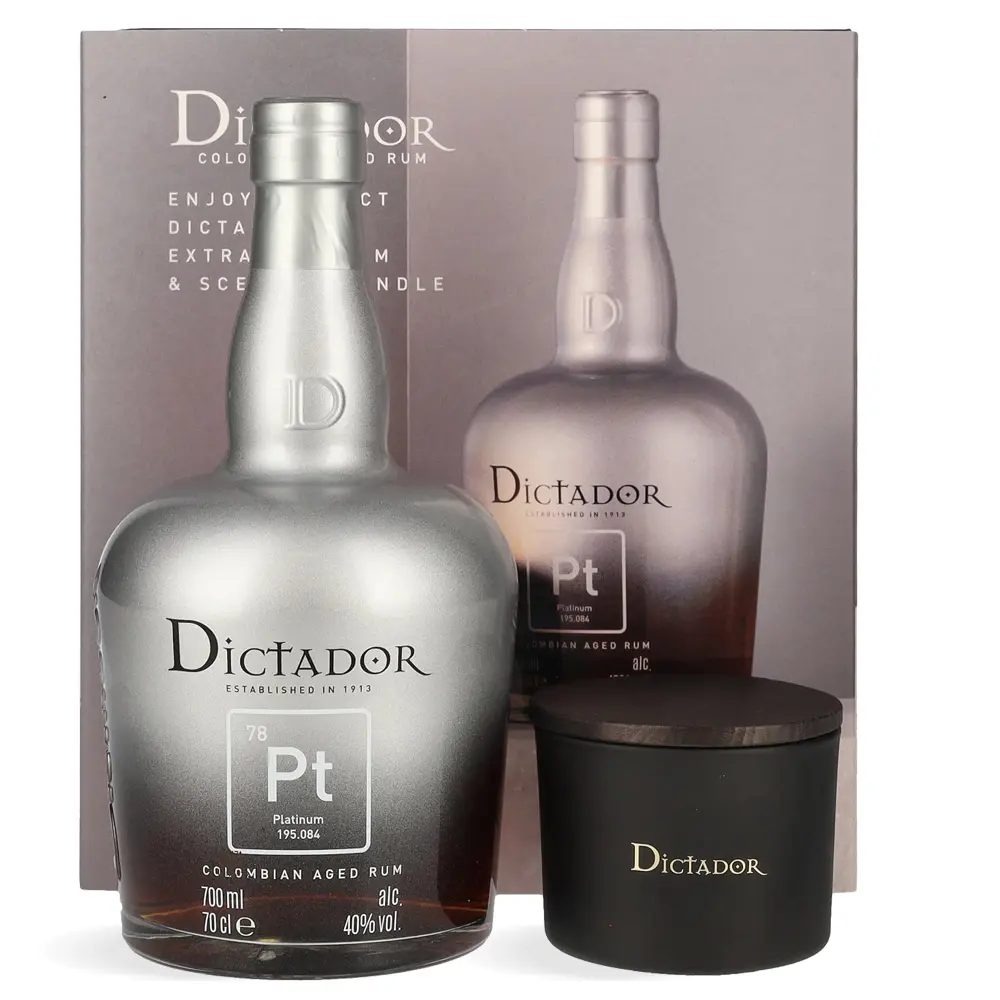 Dictador Platinum Colombian Aged Rum poklon set (sa svijećom) ekskluzivno je izdanje luksuznog kolumbijskog ruma koje kombinira bogat okus i sofisticirano iskustvo degustacije. Ovaj premium rum odležava u hrastovim bačvama kako bi razvio kompleksne note karamele, vanilije, suhog voća i hrasta, a dolazi u elegantnom pakiranju s mirisnom svijećom, savršen za stvaranje opuštajuće atmosfere i uživanje u vrhunskom rumu.