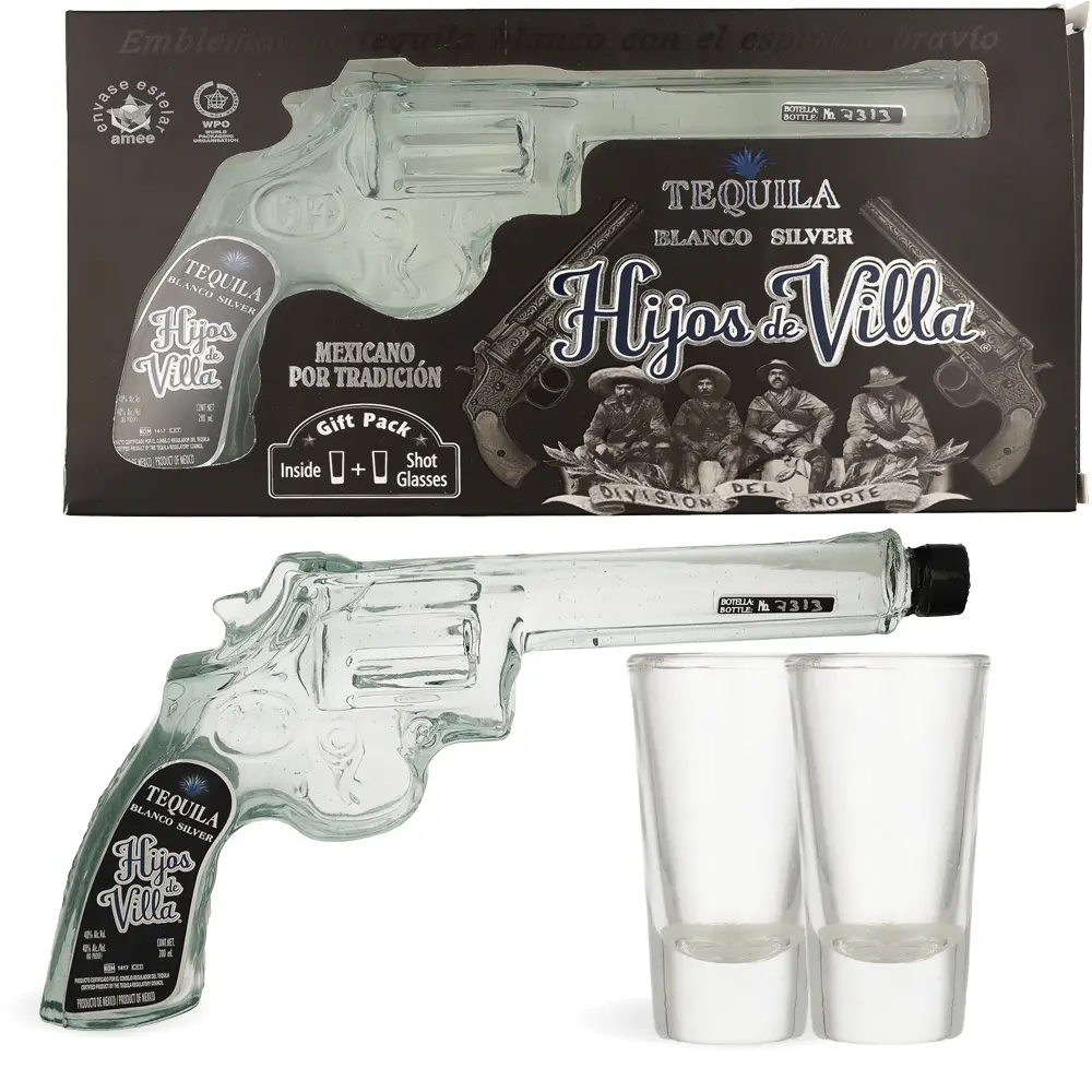 Hijos de Villa Blanco Tequila Pistol Gun & Shot Glass poklon set donosi jedinstvenu kombinaciju meksičke tradicije i originalnog dizajna. Tequila dolazi u atraktivnoj bočici u obliku pištolja, izrađenoj od stakla, zajedno s dvije čašice. Ova tequila proizvedena je od 100 % plave agave i idealna je za kolekcionare, poklone ili nezaboravno kušanje.