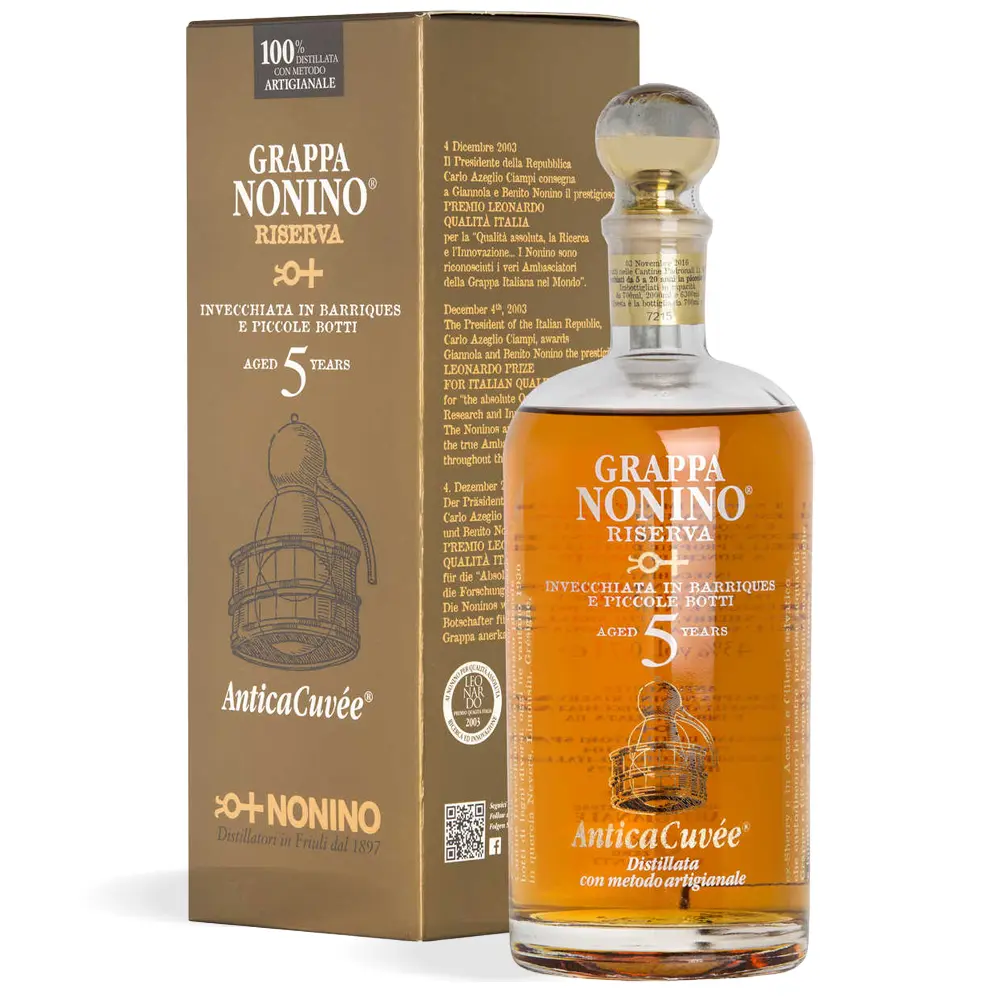 Nakon destilacije slijedi dozrijevanje tijekom pet godina u malim francuskim hrastovim barrique bačvama i bačvama koje su prethodno sadržavale sherry. Ovaj proces daje destilatu toplinu, strukturu i profinjene drvene tonove. Majstori destilacije pažljivo nadziru svaki korak kako bi osigurali ravnotežu i kvalitetu. Boca Nonino Grappa Riserva Antica Cuvée dolazi u elegantnoj poklon kutiji koja naglašava njezin luksuzni karakter i čini je prikladnom za posebne prigode.