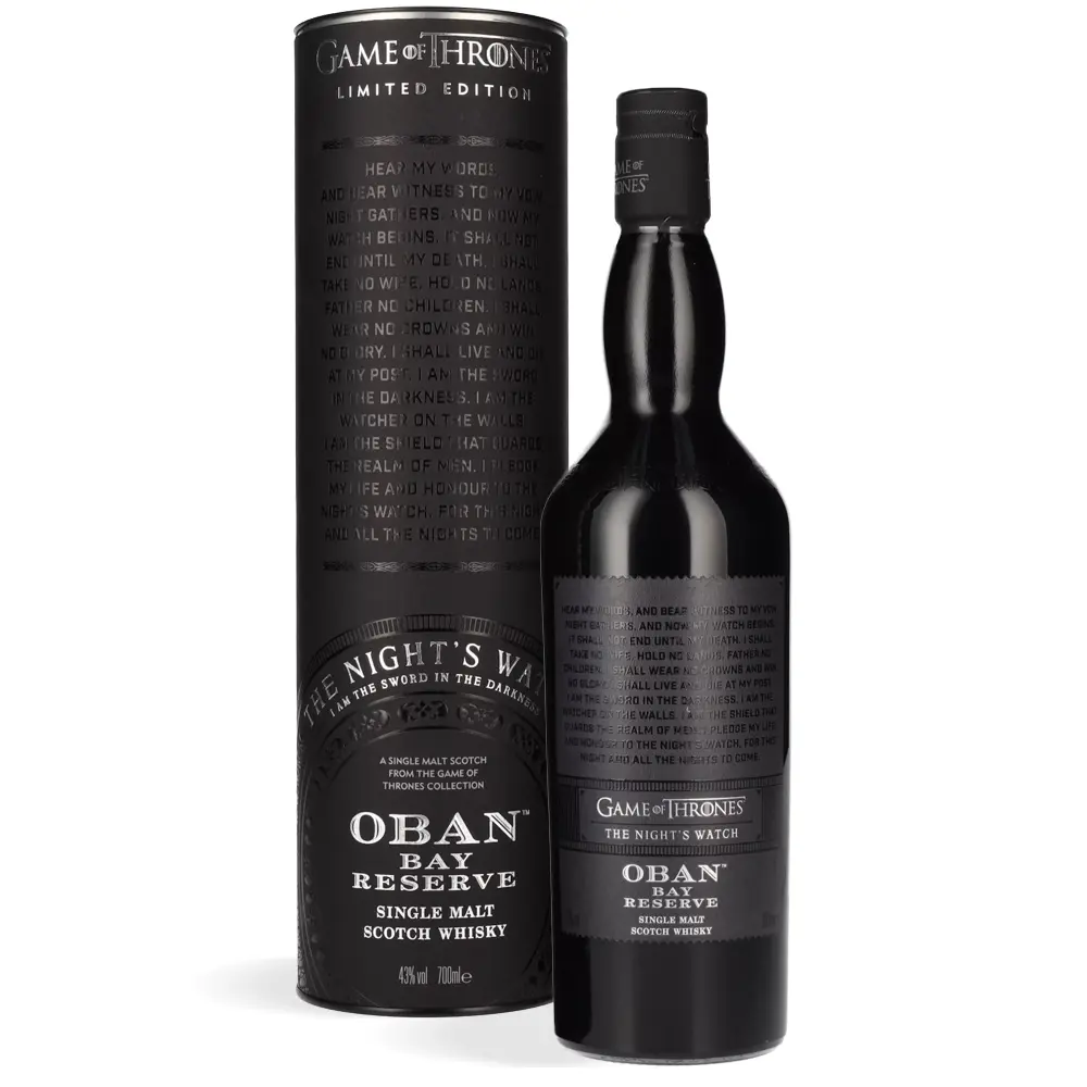 Oban Bay Reserve Game of Thrones The Night’s Watch proizvodi se u destileriji Oban, smještenoj na granici škotske regije Highlands i obalne zone, gdje se susreću kopno i more. Destilerija Oban osnovana je 1793. godine i poznata je po svojoj maloj proizvodnji i iznimnoj kvaliteti. Ovaj viski nastaje pažljivim odabirom destilata koji dozrijevaju u hrastovim bačvama, čime razvijaju ravnotežu između voćnih, začinskih i maritimnih tonova. Posebno izdanje inspirirano je Night’s Watch redom, što se odražava u njegovom snažnom i mističnom karakteru.