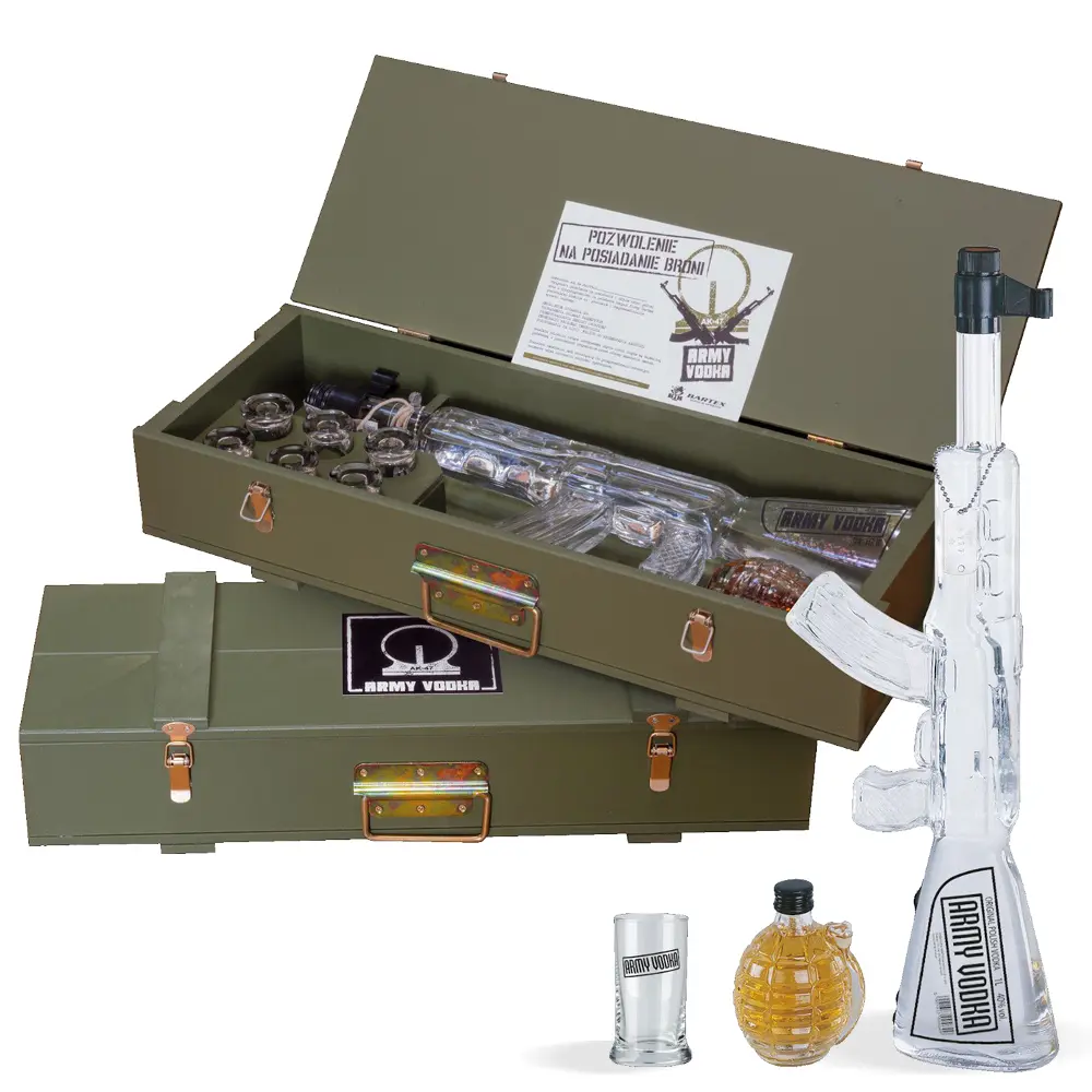 Red Army Vodka poklon set jedno je od najoriginalnijih i najprepoznatljivijih izdanja u svijetu premium votke. Smješten u drveni sanduk nalik na vojni arsenal, ovaj komplet u sebi nosi staklenu repliku slavnog AK-47, ispunjenu litrom vrhunske votke, ručnu bombu s 0,2l biljnog likera i šest čaša ukrašenih simbolom Crvene armije. Votka se ističe svojom čistoćom i glatkoćom, izrađena je od najfinijih sastojaka i kristalno čiste izvorske vode, a na nepcu otkriva blage tonove meda i vanilije koji joj daju elegantnu pitkost.