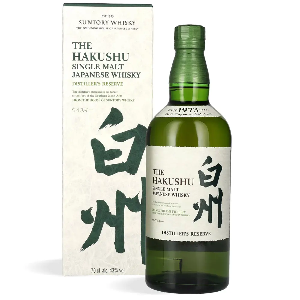 Destilerija Hakushu, osnovana 1973. godine pod okriljem kuće Suntory, smještena je u gustim šumama južnih japanskih Alpa. Ovo planinsko okruženje pruža idealne uvjete za destilaciju i dozrijevanje zahvaljujući čistom zraku, stabilnoj mikroklimi i vodi iz izvora bogatih mineralima. Destilacija se odvija u tradicionalnim bakrenim kotlovima različitih oblika, što omogućuje stvaranje višeslojnih aroma. Mješavina maltova različitog stupnja dimljenosti pažljivo se spaja u procesu blendanja koji predvodi tim majstora iz kuće Suntory.
